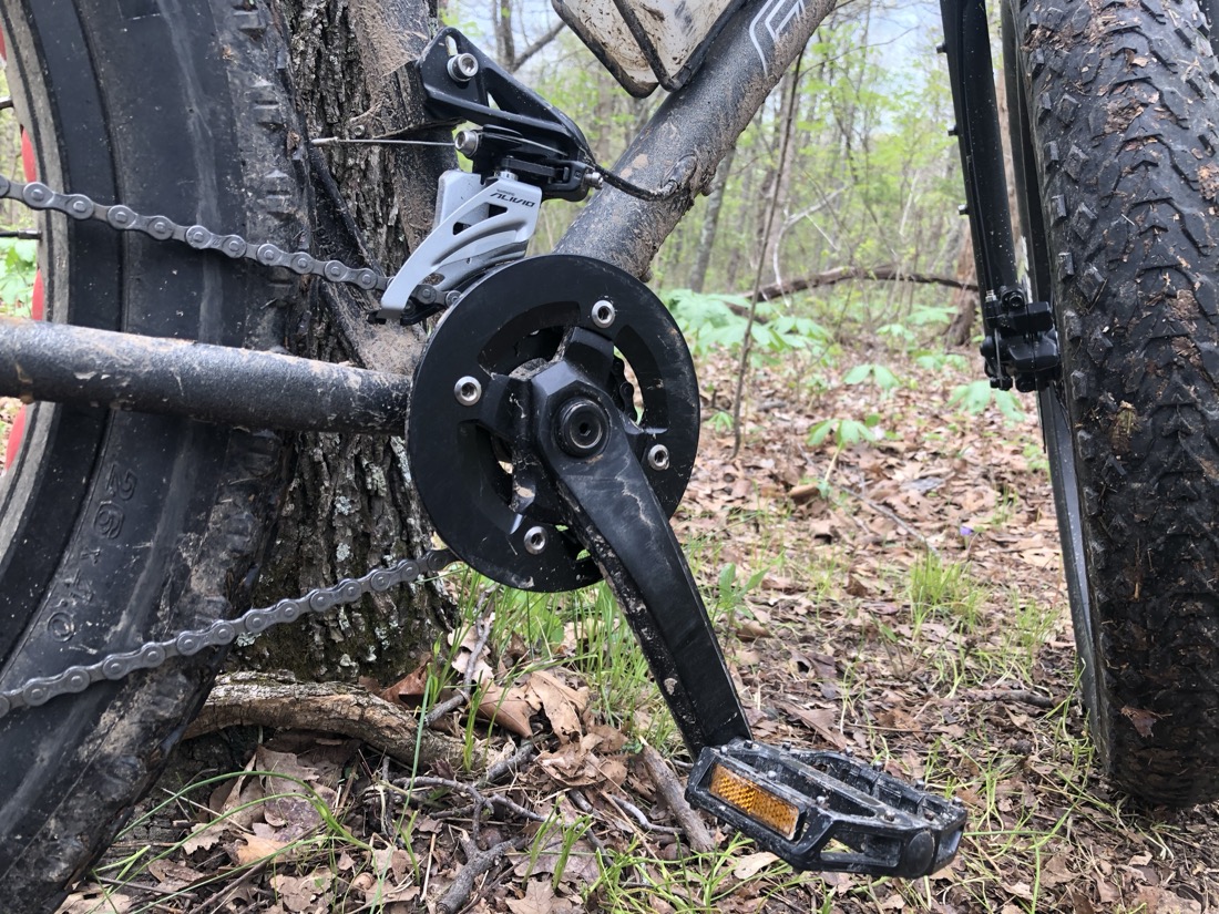 It’s a 2x drive system with a generic crank, 22/32T chain rings and an 11-34T 8 speed cassette. I found this range to be perfect for the mix of riding I do: A bit of road, gravel, trail with short, punchy climbs on the trail. The lowest gear enables me to get up the steepest climb with no problem. For some riders that might have health issues or physical constraints a lower gear might be helpful on the trails but I think this range is good for most. All that said I think I’d prefer a 1x 10 speed on this bike. Similar to the Poseidon X but with a slightly lower gearing. The second chainring on a fat bike seems unnecessary given that it is likely going to be primarily ridden off road.